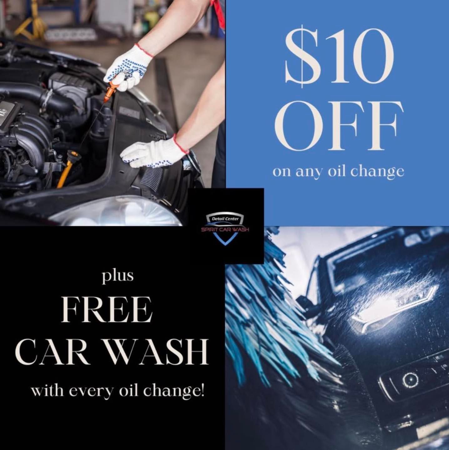 Free exterior wash with any oil change, plus ten dollars off the service total